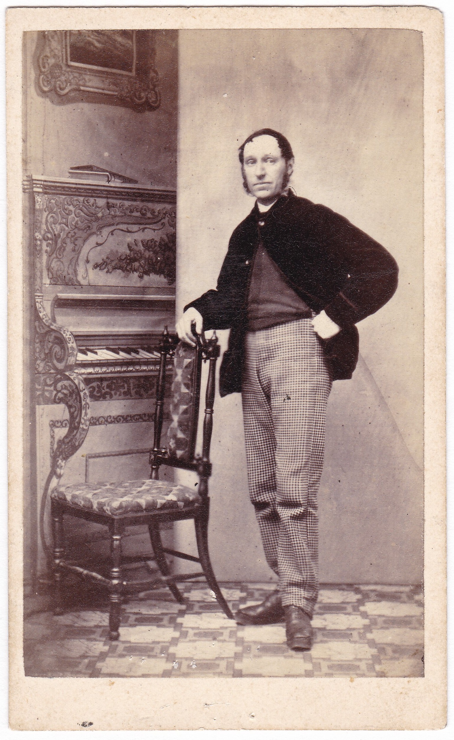 He gives me strong minor-Charles-Dickens-character vibes, with his checked pants. And I have never seen such thick-soled shoes in images of this period (now I’ll probably start seeing them everywhere). I like the idea that this was a test shot–he has a skeptical expression that makes me think he wasn’t too worried about how this portrait would come out.