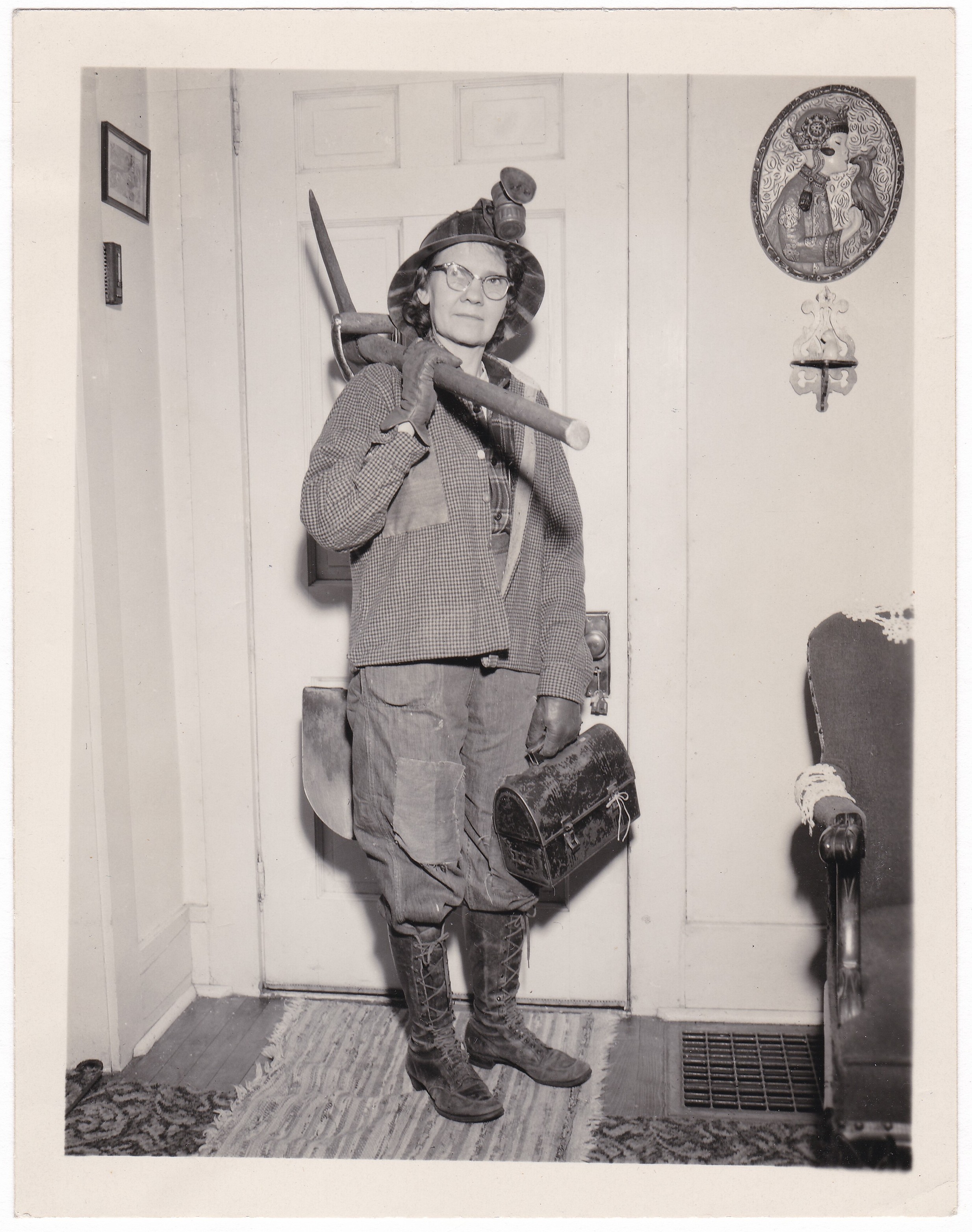 This 4×5-inch photo comes with no information (name, place, date, etc.). Shall we assume she’s an actual miner, not just costumed as one? It doesn’t seem to be a terribly old photo. If this is in the U.S., then it’s probably no earlier than the 1970s, given the history of women in mining I found here. I wondered if she had long dreamed of going into the mines, or if she was simply taking whatever job she could to make ends meet. But given her strong, confident look, I’m guessing her decision to be a miner wasn’t a huge stretch.