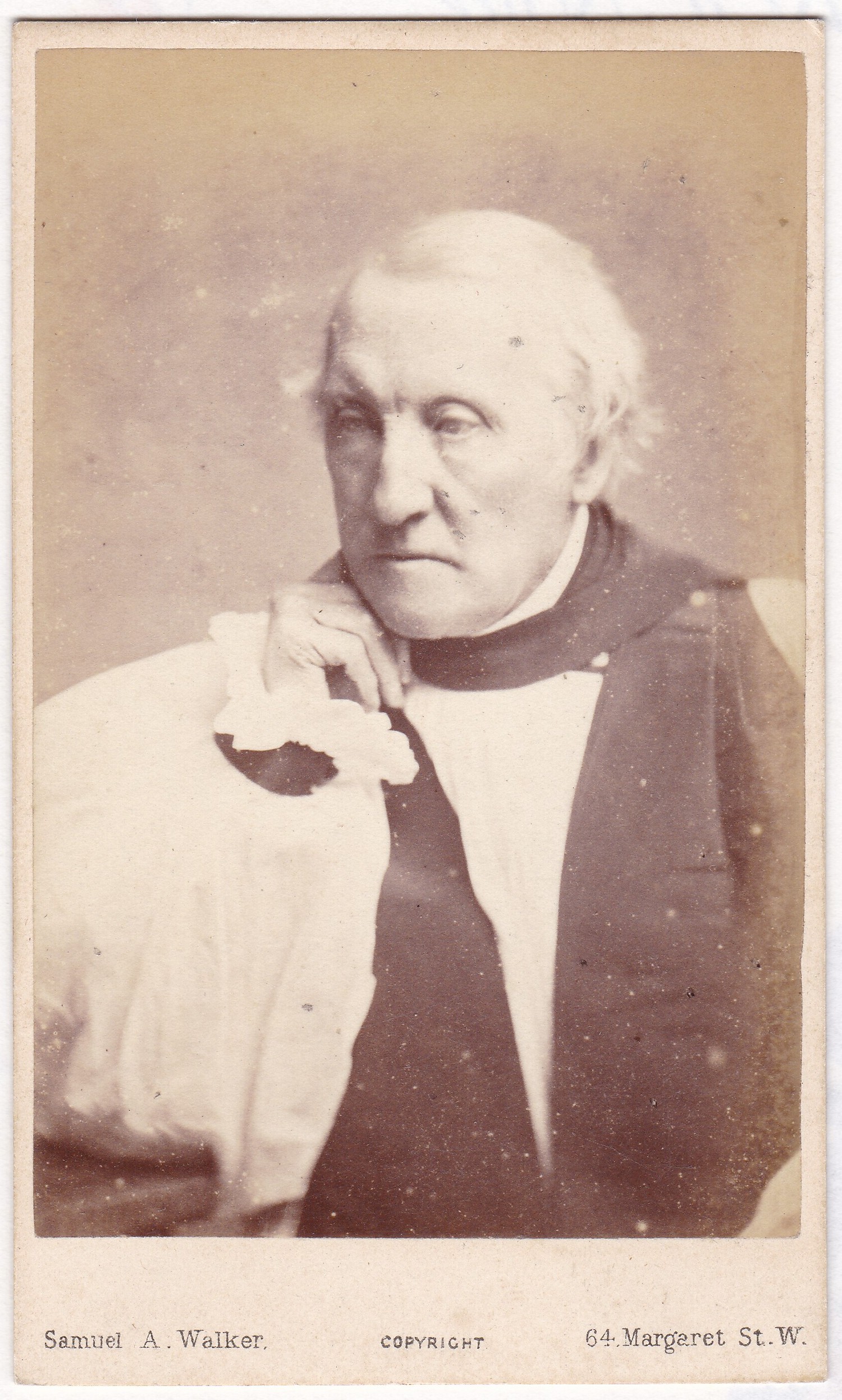 This little carte de visite caught my eye because of the unusual garments, the introspective pose, and that imposing face. Somebody wrote “Bp Chichester” on the back, which made it easy enough to do a search and figure out that this was The Right Reverend Richard Durnford, who served as the Bishop of Chichester from 1870 to 1895, when he died at age 92. (See info here.) The photographer, Samuel A. Walker of London, promotes himself as “Fine Art Photographer To The Queen, Bishops & Clergy”, though noting that he also photographs “Ladies, Children, and Laymen”. Imagine what it must have taken to build a clientele like that.