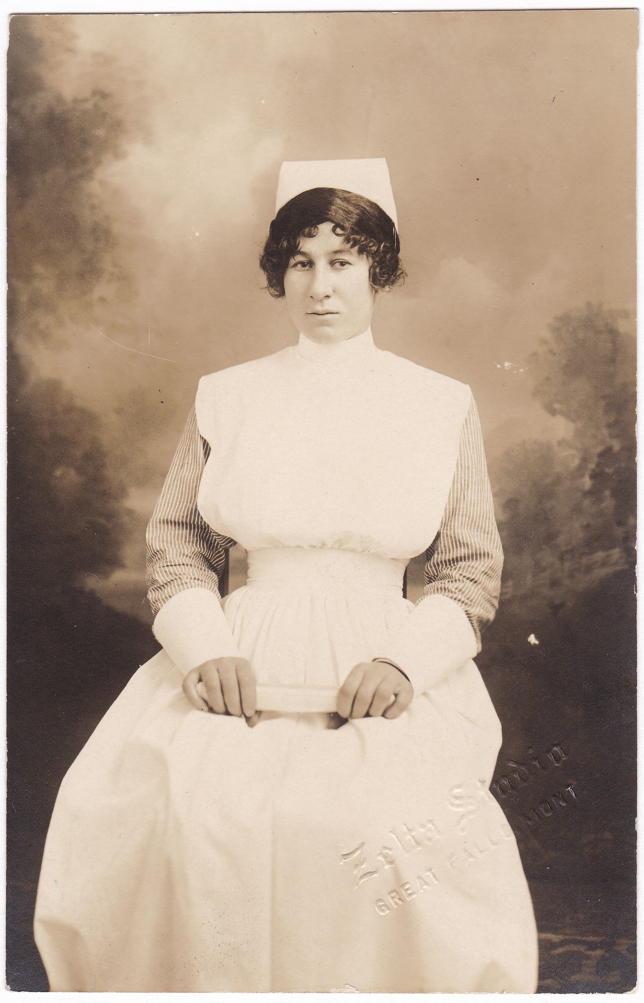 This is a real photo postcard whose manufacturer’s markings (AZO, four triangles pointing up) indicate a date range of 1904-1918. Embossed on the lower right is the photographer’s name: Zelta Studio / Great Falls, Mont. Our sitter is dressed as a nurse and holding what appears to be a scroll, which suggests to me that this is a photo to commemorate her graduation from nursing school. I’m concerned that she looks like she’s having second thoughts about all this, but hopefully the photographer just caught her in a distracted moment. Strangely, her expression looks a little more sanguine in the enlarged version than in the actual-sized one.