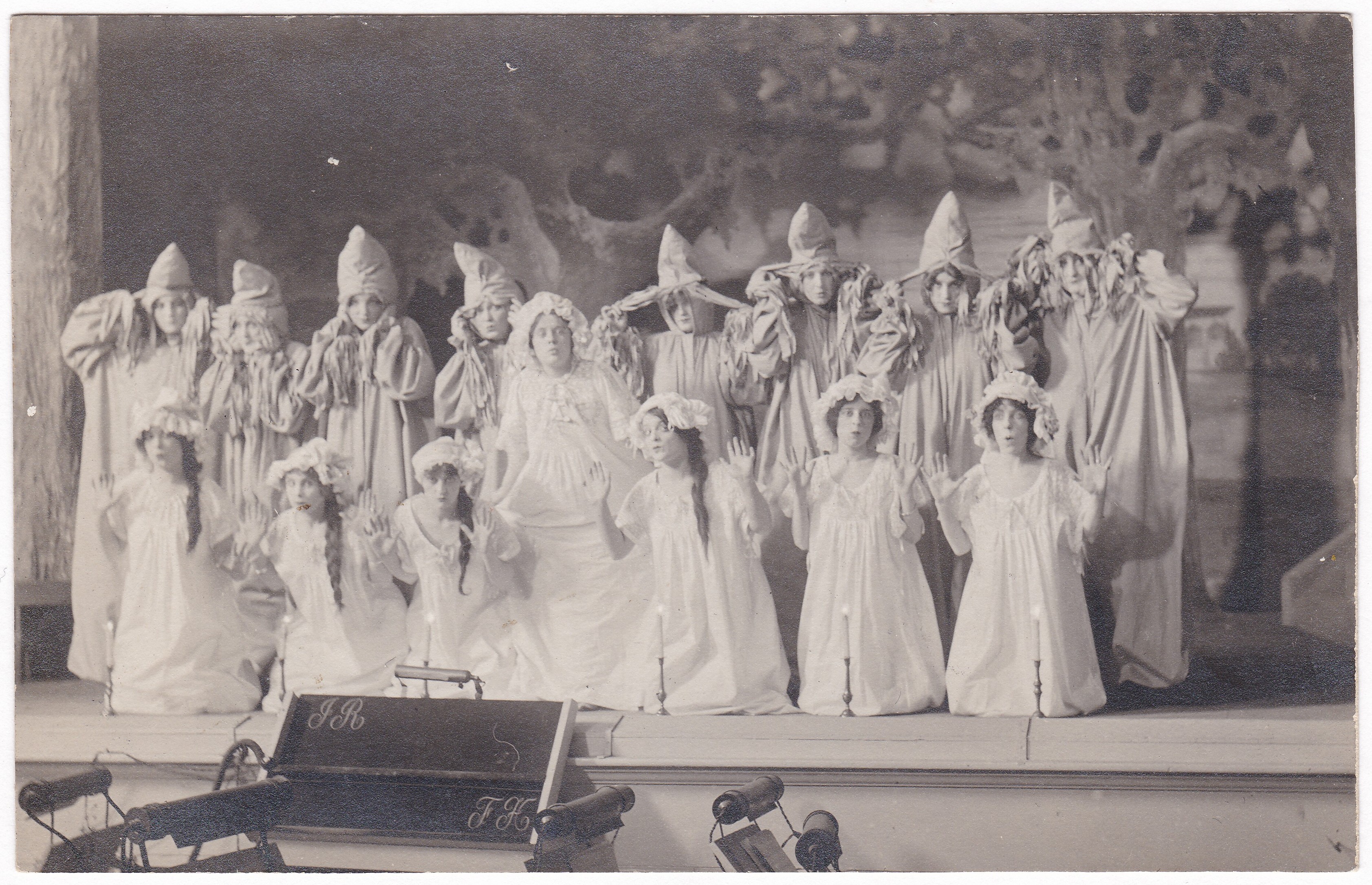 I love vintage photos of performances, whether bygone interpretations of shows with which I’m familiar, or pictures that make me wonder what on earth was going on. This image definitely falls into the latter category. Of course, this could be a scene I know, such as Titania waking up from her dream in “A Midsummer Night’s Dream”. But more likely, it’s some sort of musical pageant that might seem as odd to us today in performance as it does in this out-of-context picture. As someone with a lifelong interest in live performance, it fascinates me to see how styles and standards have changed over the years, not just the wacky costumes, but things like the candles with what appear to be actual flames in front of each of the kneeling women. Whatever this performance was, I hope it was well received. By the way, this is a real photo postcard, whose manufacturer’s markings (open-script Cyko) date it rather vaguely to 1904-1920s, which seems about right.