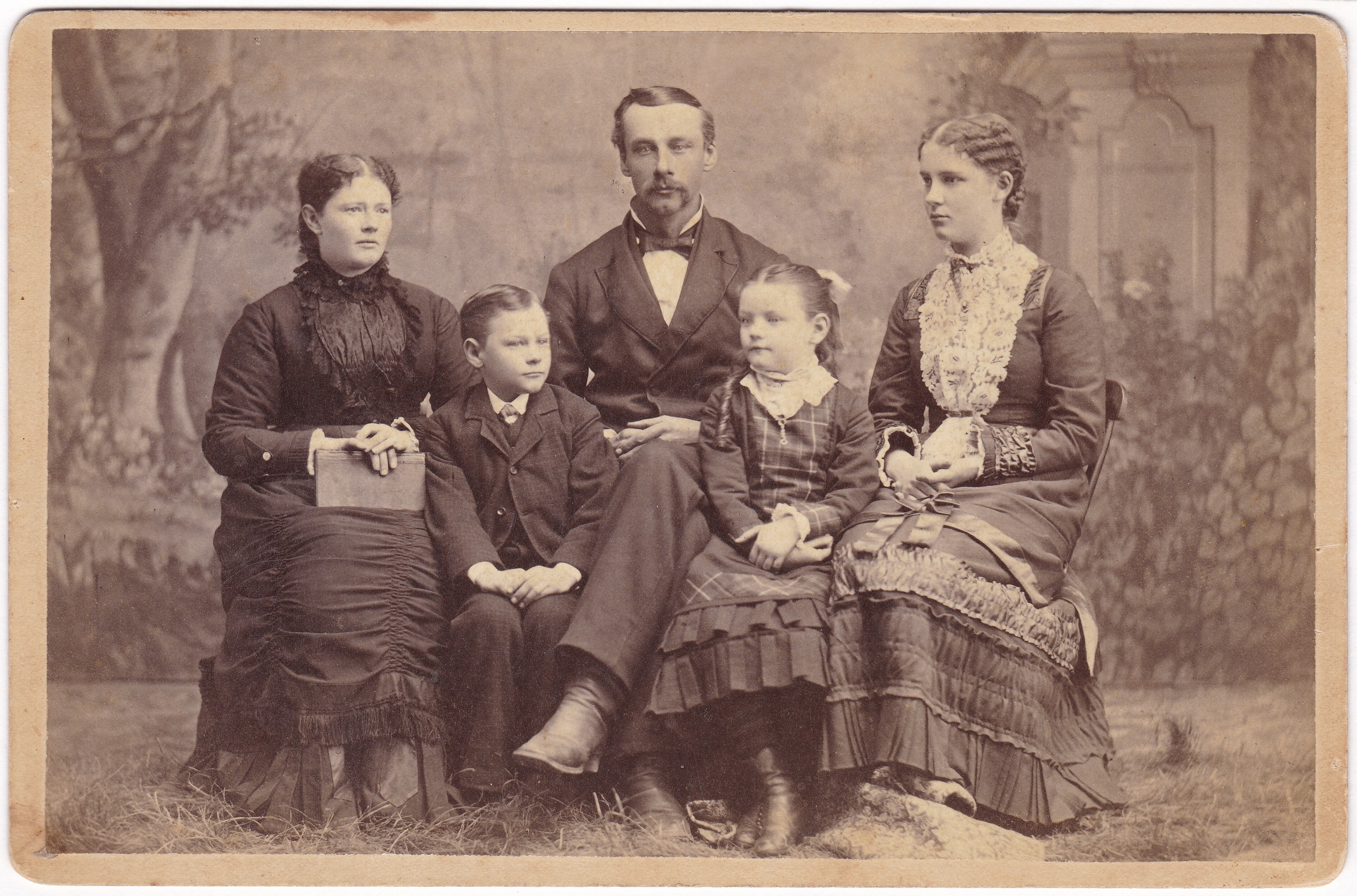 This is a cabinet card with no information at all. There’s plenty to admire in this picture, but I think there’s something a bit amusing about the way the man’s leg is sticking out between the children, calling attention to how closely they’re shoved together, despite what appears to be enough room to spread out a little more.