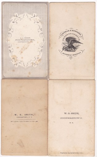 You can click below to see the backs. The upper left is by A. A. Cooley of Cooperstown, NY. I found a small item in a local newspaper from 1888 that said “Mr. A. A. Cooley, by a new process, is now enabled to take pictures after sundown. He has made several excellent negatives in the evening lately.” The upper right is by Getman & Bowdish of Richfield Springs, NY. And the bottom two are by W. G. Smith of Cooperstown, who I think is Washington G. Smith.